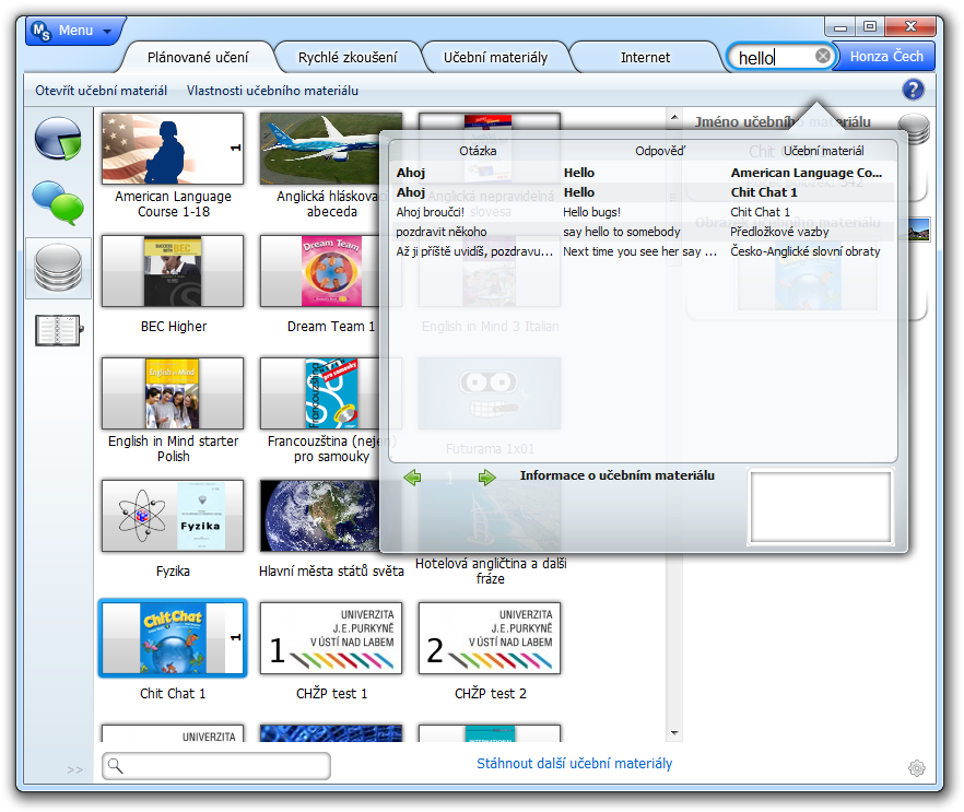 Na uvedeném obrázku si můžete všimnout, že uživatel má v učení 2x slovíčko Hello (slovíčka, která jsou v učení jsou označena tučně).